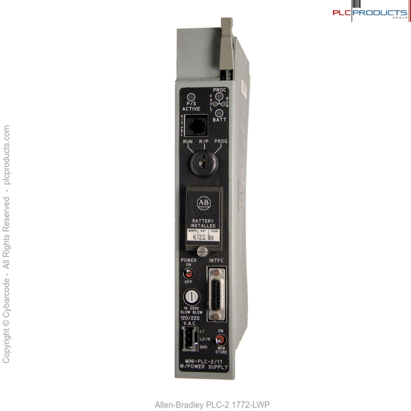 The 1772 Mini-PLC-2/17 Programmable Controller 1772-LWP is a digital, electronic, solid state industrial programmable controller capable of monitoring and controlling up to 128 I/O devices. The Controller has a Processor, a power supply and a number of user-selected I/O Modules chosen for the number and type of I/O devices in the user's application. By selecting the appropriate modules, the user can assemble a complete programmable controller system to meet the application requirements.