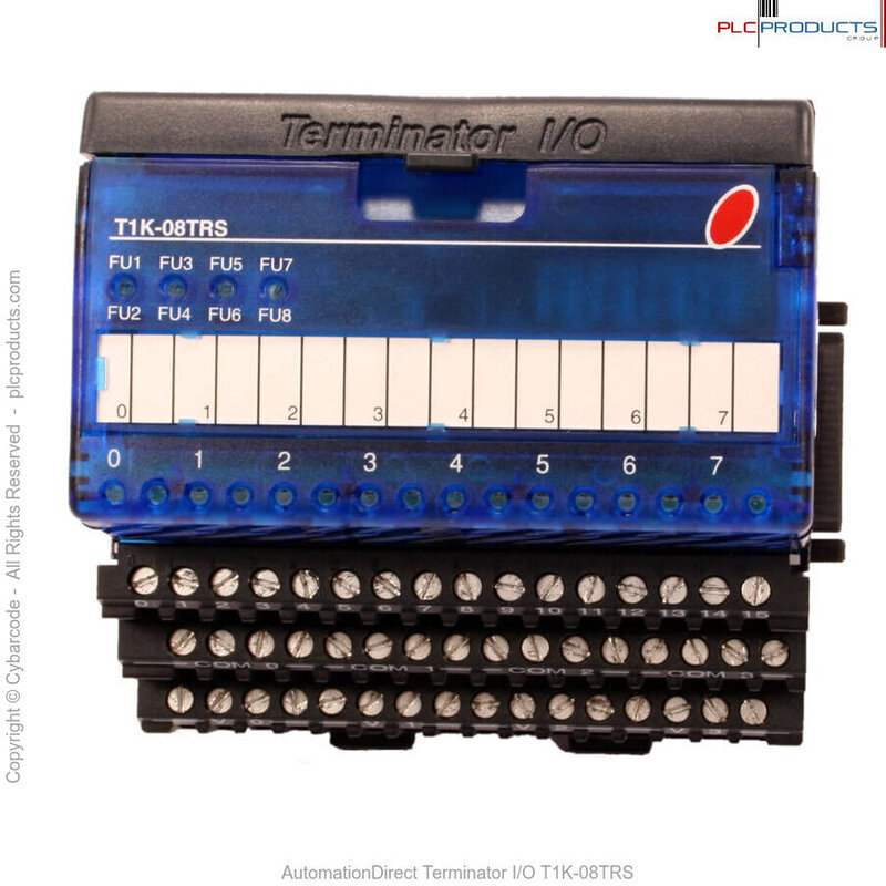 The T1K-08TRS is an 8-point 5-30 VDC or 5-240 VAC isolated relay output module, 8 Form A (SPST) relays, 1 point per common, 7.0A/point max. with 8 replaceable fuses.