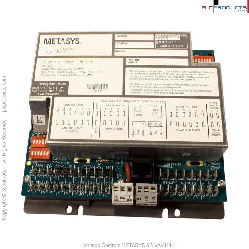 The Johnson Controls AS-VAV111-1 is a Variable Air Volume Digital Controller used to control single duct, fan-powered, and supply/exhaust VAV box configurations. Can be used as a stand alone controller or connected to the Metasys Network through a Network Control Module(NCM) or Companion through an N2 bus.