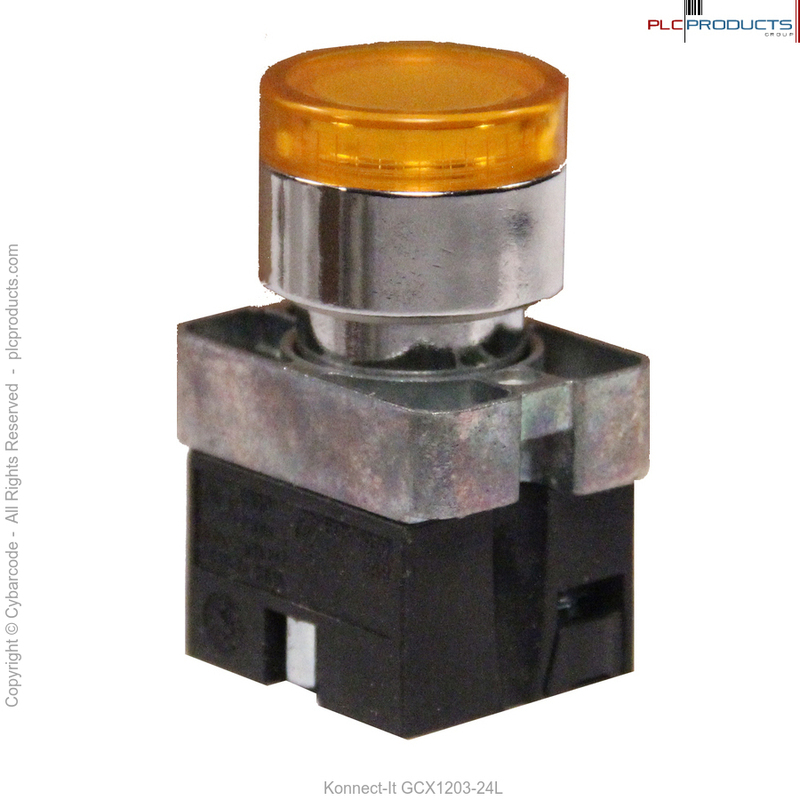 Automation Direct GCX1203-24L. Pushbutton, 22 mm, momentary, LED illuminated, (1) N.O. contact(s), metal base, metal bezel, plastic ring, Operator: yellow, flush, 30 mm, round, plastic, 24 VAC/VDC, full voltage.