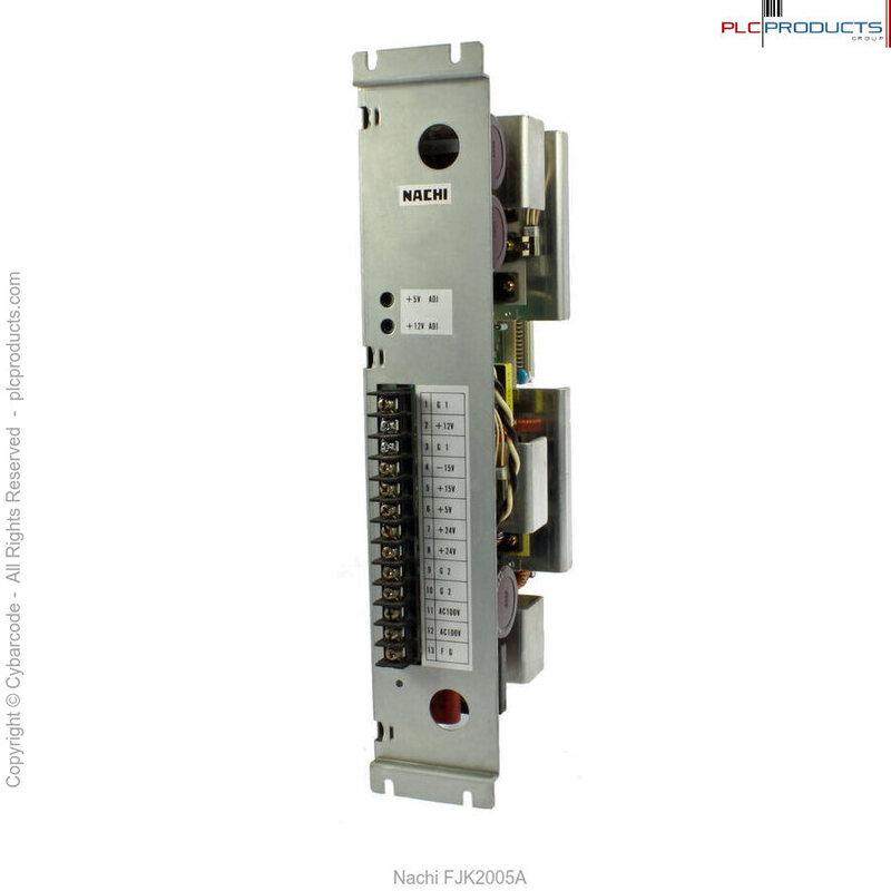 This product is a Nachi FJK2005A POWER SUPPLY Card with a NEC-14T motherboard connected. There are 13 input connections along with 2 ports of +5V ADJ and +12V ADJ Adjustment mechanisms.