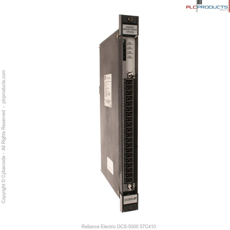 The Reliance 57C410 is a four channel analog output module for use with the DCS 5000 controller. This module contains four 12-bit D/A converter channels. Each channel can provide 5 volt, 8 volt 10 volt or 4-20 mA current output. Each output has its own isolated common.