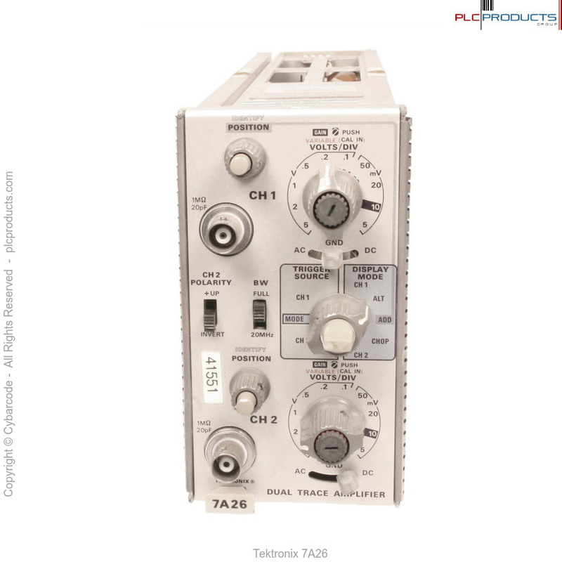 The Tektronix 7A26 is a dual-trace amplifier that provides a bandwidth of 200 MHz in the 7000 series mainframes. With the appropriate mainframe, DC to 200 MHz bandwidth is maintained constant over the entire range of deflection sensitivities of 5mV to 5V/div. Bandwidth may be limited to 20 MHz to reduce displayed noise in lower frequency applications. The 7A26 feature five operating modes, trigger source selectability and trace identity.