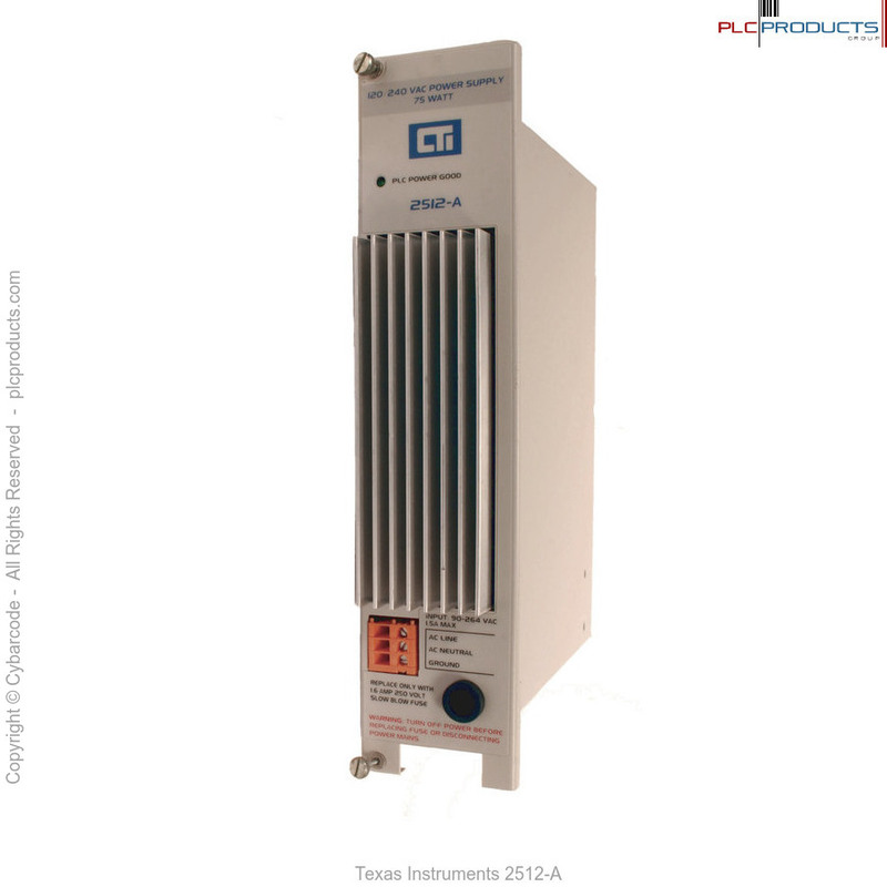 The 2512-A is a 120/240VAC Power Supply designed for CTI 2500 SeriesTM and SIMATIC® 505® PLCs. The triple-wide module provides up to 75 watts at +5VDC for use by the PLC CPU and I/O modules. When operated in a dual configuration in a 2500-R11-A base, it provides support for power supply redundancy.