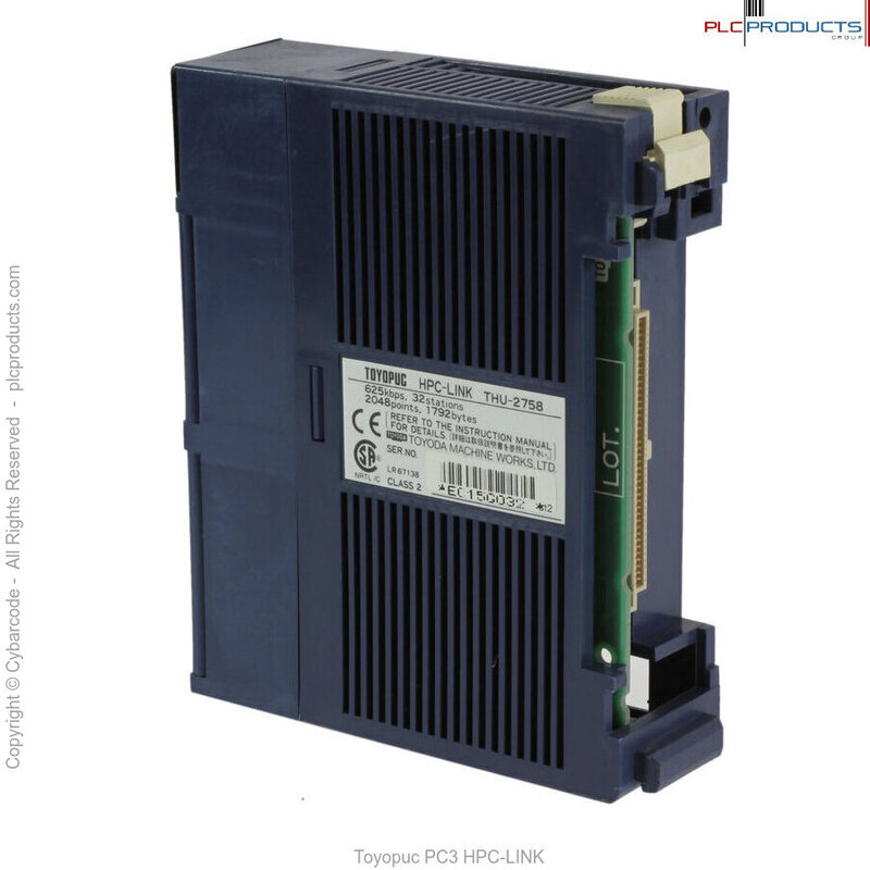 This module allows high speed PC link communications within the Toyopuc PC3 PLC Series. It provides the following speed and memory: PC link (19.2/57.6 Kbps,16 ST, 512 points) or computer link (selection of 0.3~19.2 Kbps 32 stations) , 625 Kbps, 32 stations, 2048 points, 1792 bytes.